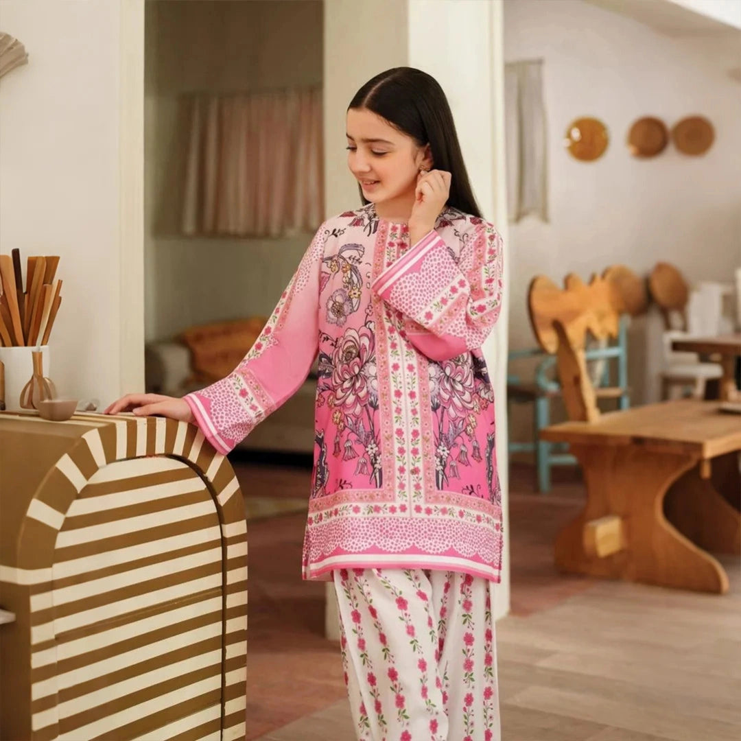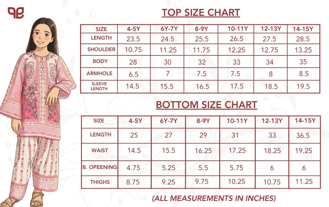 Crafted from premium soft silk fabric imported from China, this kids’ co-ord set feels smooth, breathable, and lightweight on the skin. The bright floral digital print brings a cheerful and playful touch, making it perfect for festive events, family outings, and special occasions. 🔲 Product Details Fabric: Premium soft silk (Imported from China) Work Type: Digital sublimation print. Salwar Fabric: Premium soft silk (Imported from China). Waist: Free Size (Elastic & Expandable). Check the size chart for accurate measurements and choose the best fit. Both the top and salwar are made from the same soft fabric, giving kids a neat and matching look. The salwar comes with a comfy elastic waist, making it easy to wear and perfect for growing children. 🔳 Size Guide (All Measurements in Inches) 4/5 Years: Long-23.5, Body-28, Sleeve-14.5 inch. 6/7 Years: Long-24.5, Body-30, Sleeve-15.5 inch. 8/9 Years: Long-25.5, Body-32, Sleeve-16.5 inch. 10/11 Years: Long-26.5, Body-33, Sleeve-17.5 inch. 12/13 Years: Long-27.5, Body-34, Sleeve-18.5 inch. 14/15 Years: Long-28.5, Body-35, Sleeve-19.5 inch. NB: Colour & print figures may be slightly different due to lighting, display variation or resolution. Feel free to contact us on WhatsApp or Messenger for orders and more information about this dress. We’re here to assist you!